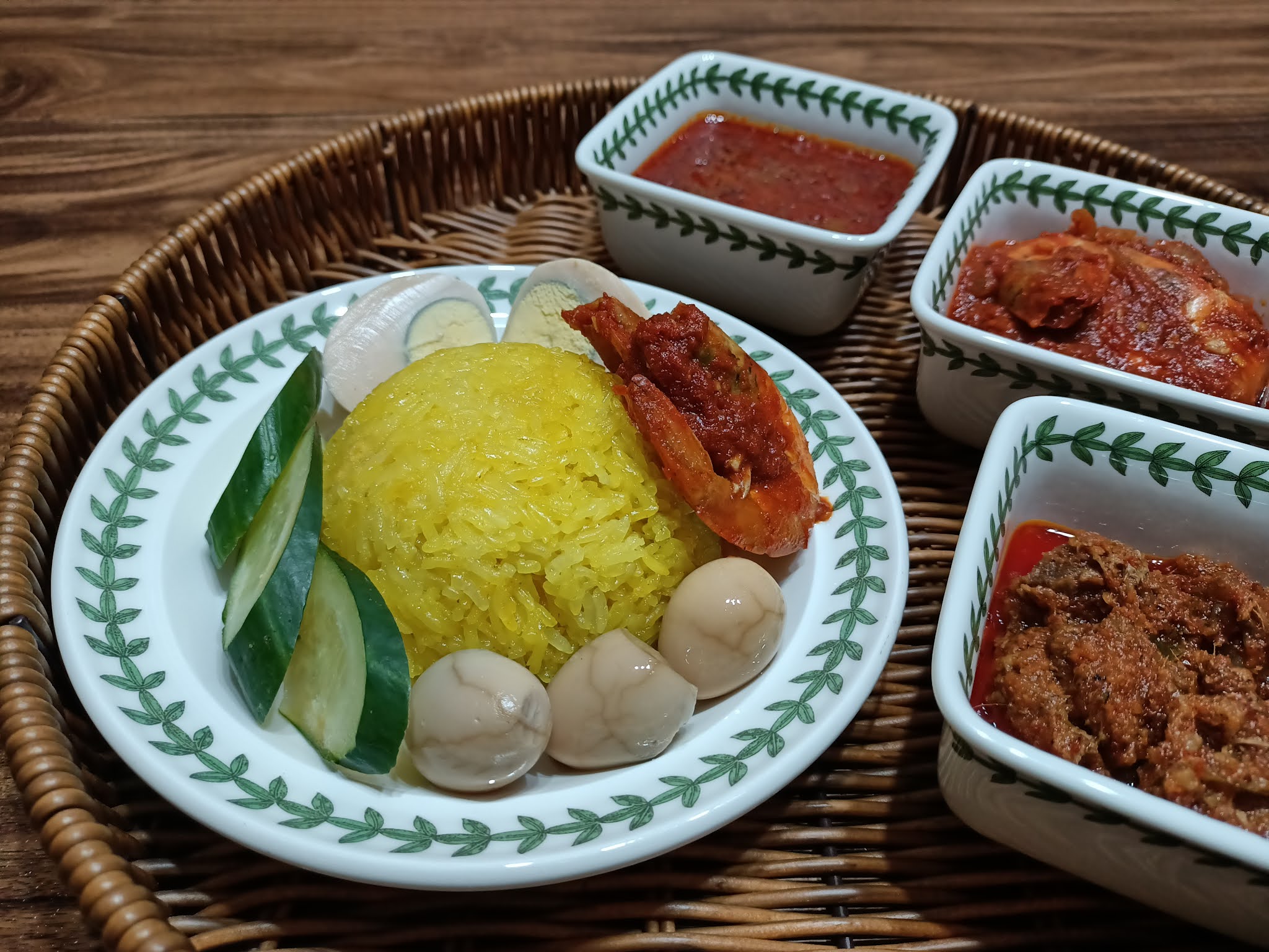 Pagi tadi, keluarkan dari peti sejuk. Kukus semula pulut, panaskan rendang daging dan sambal udang.