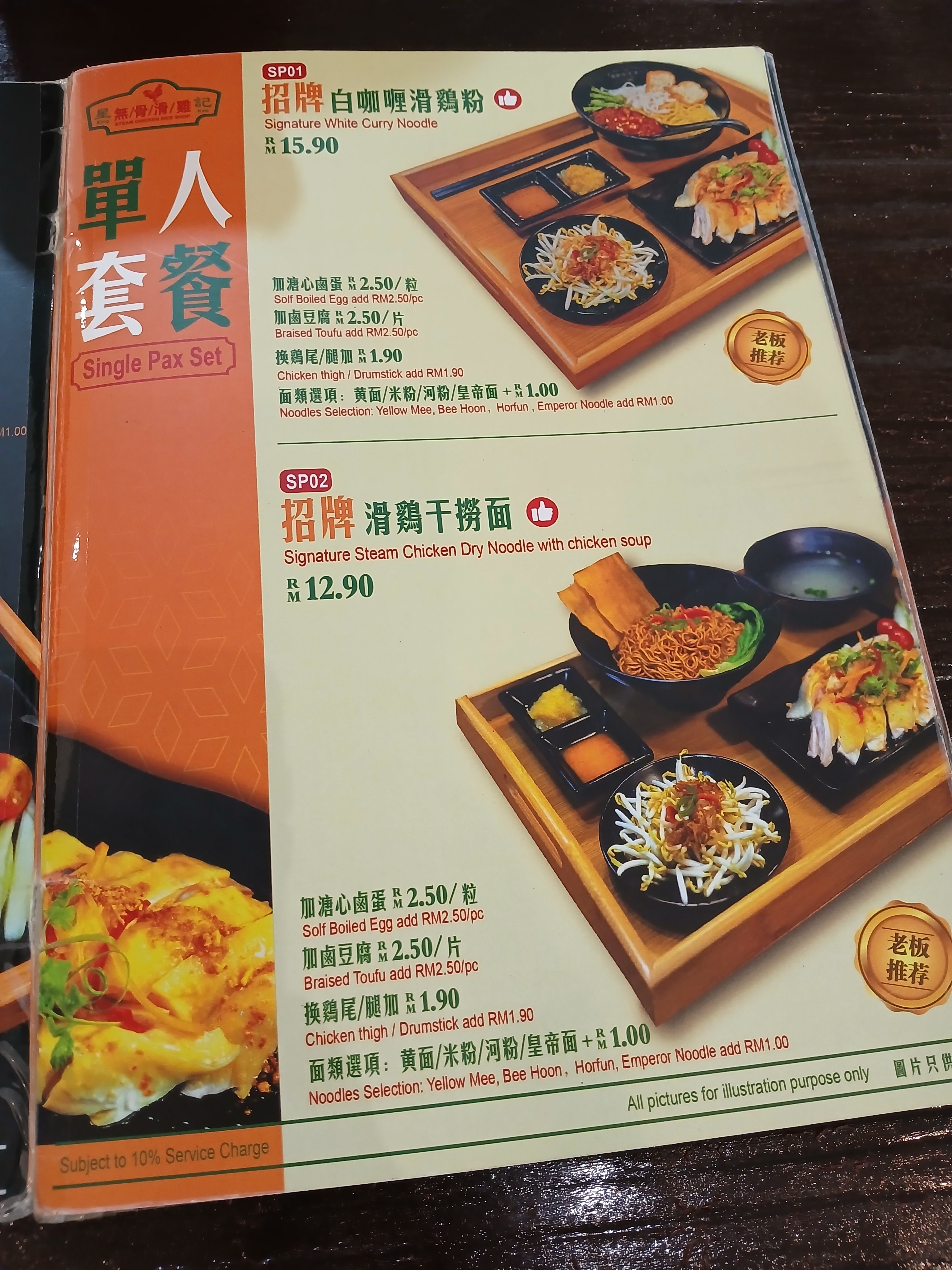 Menu di sini terdapat dalam set individu dan berkumpulan. Yang original nya tentulah nasi dimakan bersama ayam tapi selain nasi ada pilihan lain seperti hor fun, mihun, nasi goreng dan beberapa pilihan lain. Ia dihidangkan bersama ayam yang dikukus, sambal cili dan halia, sup serta tauge goreng. Sk pilih nasi goreng. Nasi goreng ringan jer, bukan berencah yang berat, cuma telur.